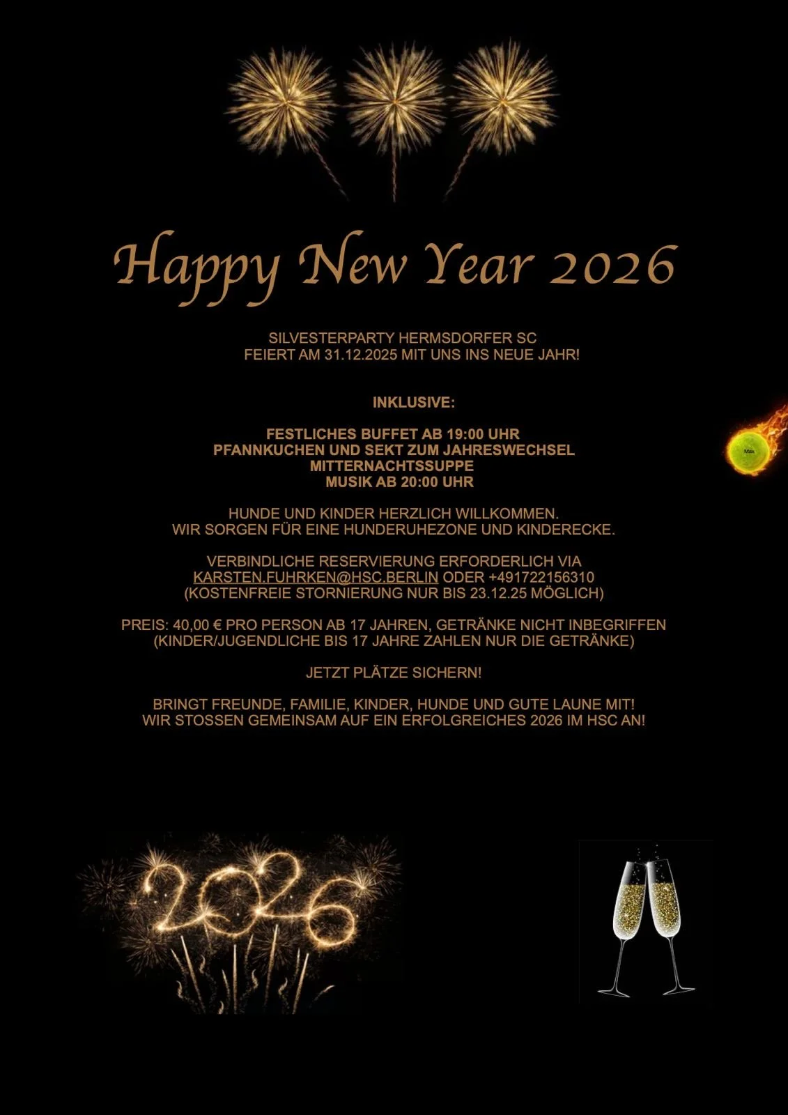 Zunächst freue ich mich sehr auf unsere Silvesterparty. Anmeldungen gern per E Mail bei mir, per WhatsApp, Nachricht oder Anruf. In den nächsten Tagen werde ich außerdem eine Anmeldeliste im Clubhaus auslegen.